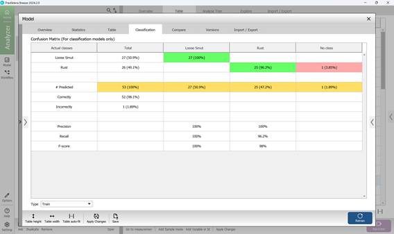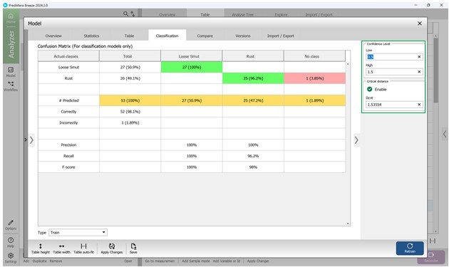 Четвертый раздел под названием «Classification» содержит информацию о матрице ошибок (рисунок 69), где в столбцах указываются классы, по которым осуществляется классификация определяемых заболеваний сельскохозяйственных культур, а в строках указываются правильные классы для раннее заданных параметров образцов. К примеру, на рисунке 69 только один образец (1,89 %) классифицирован неверно. Для регулирования диапазона классификации исследуемых пораженных участков в пределах образцов отобранных сельскохозяйственных культур используется доверительный интервал, который позволяет реализовывать статистическое моделирование значений матрицы ошибок. Чем выше показатели нижнего порога интервала, тем больше модели требуется совпадающих характеристик, чтобы отнести образец к определенному элементу, раннее обученной модели (рисунок 70).