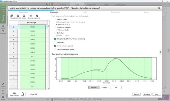 2) Choosing spectral bands within defined wavelength ranges - typically covering the entire spectrum with SNV preprocessing applied by default - including: