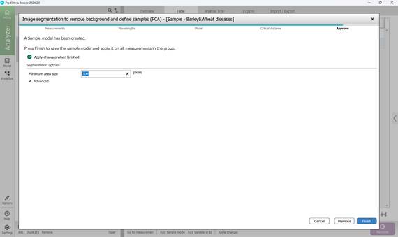 5) The reference model is finalised by setting a minimum region size (typically around 300 pixels) to filter out noise. This value can be adjusted depending on the size of the regions of interest and prior pixel selections. After completion, the reference model is automatically applied to the image dataset (Figure 51).